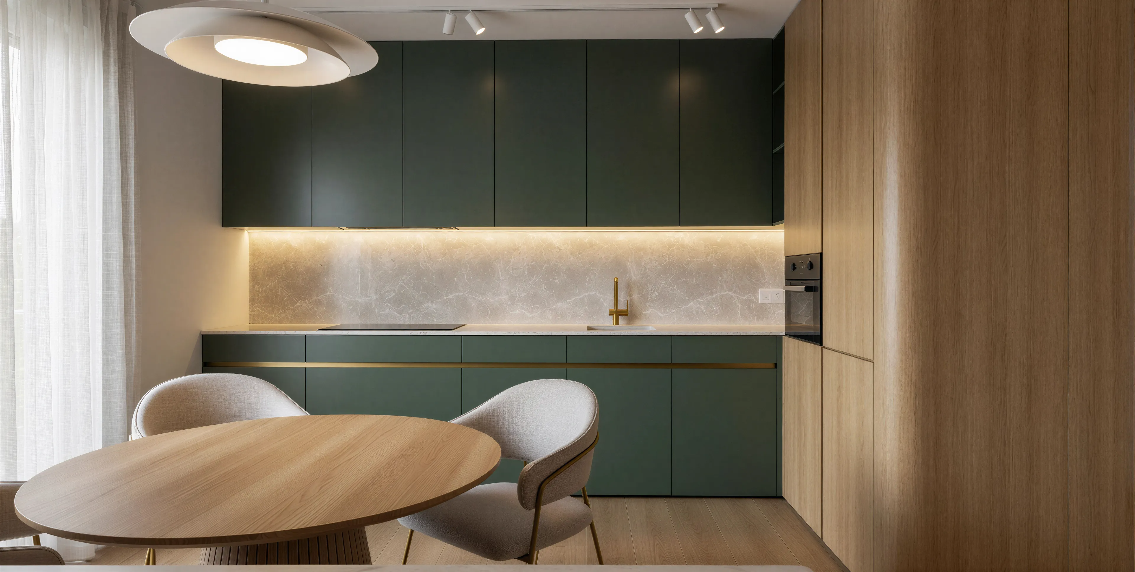 Materiálová paleta v projekte Interiér 3kk bytu kombinuje eukalyptovú zelenú v kuchyni s béžovými tónmi a dubovou dyhou. V zariadení sa bude kombinovať s jemnými tónmi ružovo-tehlovej. Táto kombinácia prináša jemný kontrast, vizuálnu hĺbku a nadčasovosť bez pôsobenia chladne či stroho. Výsledkom je pokojný, funkčný interiér, ktorý prirodzene podporuje kvalitu bývania a rešpektuje meniace sa potreby jeho obyvateľky.